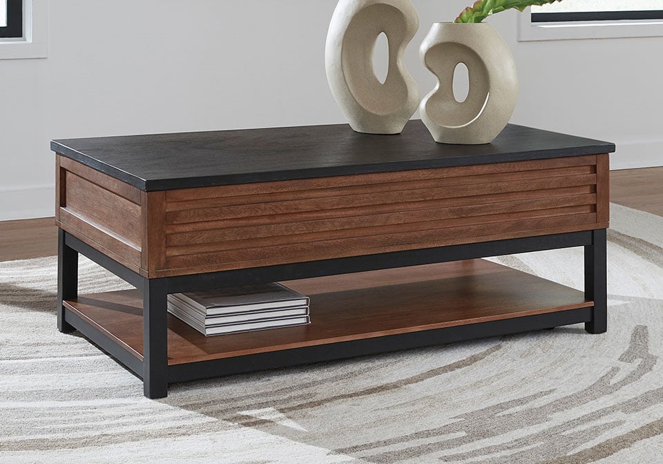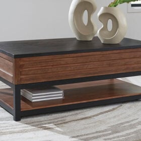 Double down on casual chic with the two-tone look of this lift-top coffee table. Its warm brown and matte black finishes reflect your eye for modern design. The trend-right slatted styling brings added charm. And with a handy lift top, working from home or catching up on a show with dinner is a breeze.