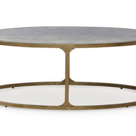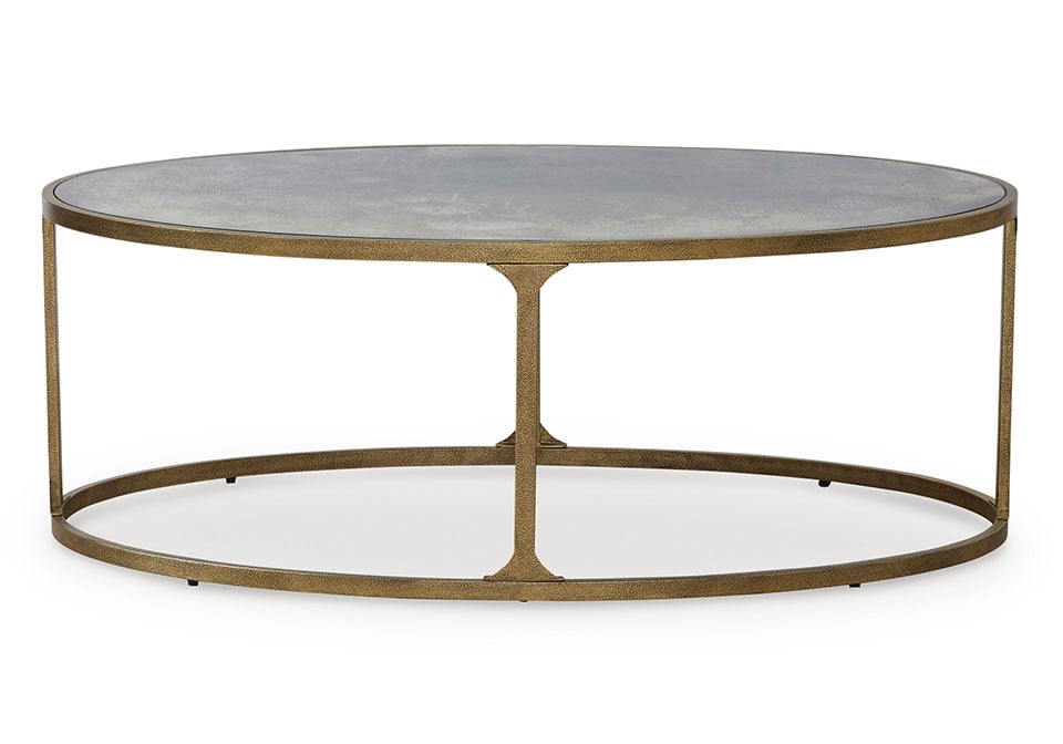 This coffee table blends a traditional feel with contemporary design cues. Antiqued gold texturing on the frame has the look of timeworn, hand-forged metal. A tempered glass top with a faux marble finish provides a refined contrast. Chic when hosting decor or holding entertainment essentials, this table rounds out your living room with transitional flair.