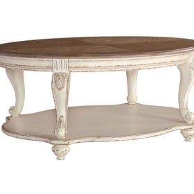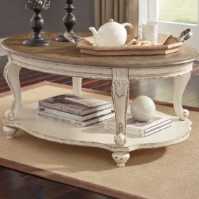 Elevating the art of traditional cottage styling, this oval coffee table is sure to serve you beautifully for years to come. Antiqued two-tone aesthetic blends a chipped white with a distressed wood finished top for added charm. Classic cabriole legs and shapely lower shelf are a lovely twist. Decorative corbels add refinement.