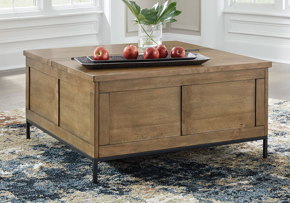 Made for the everyday, this coffee table is a sleek complement to your casual contemporary living room. You’ll love the refined-yet-relaxed vibe of its contrasting medium brown finish and matte black legs. Store throw blankets and more under the spacious hinged lid. And for added function, the other half of the tabletop conveniently lifts to become an instant work from home desk or dining space.