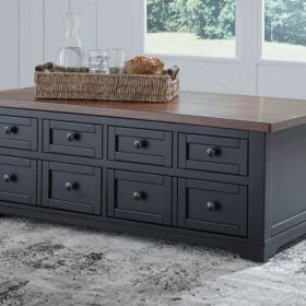 Raise the bar on modern farmhouse style with this lift-top coffee table. Its sturdy silhouette and casual good looks are accentuated with a two-tone finish, which pairs a warm satin black base with a contrasting butcher block veneer top. Combining form and function, its lift top extends for a casual dinner or extra work space in front of your sofa. Two spacious lower drawers and handy storage bins under the top make this piece awfully useful, too. Whether your style is vintage, country or eclectic, this table adds a hearty element.