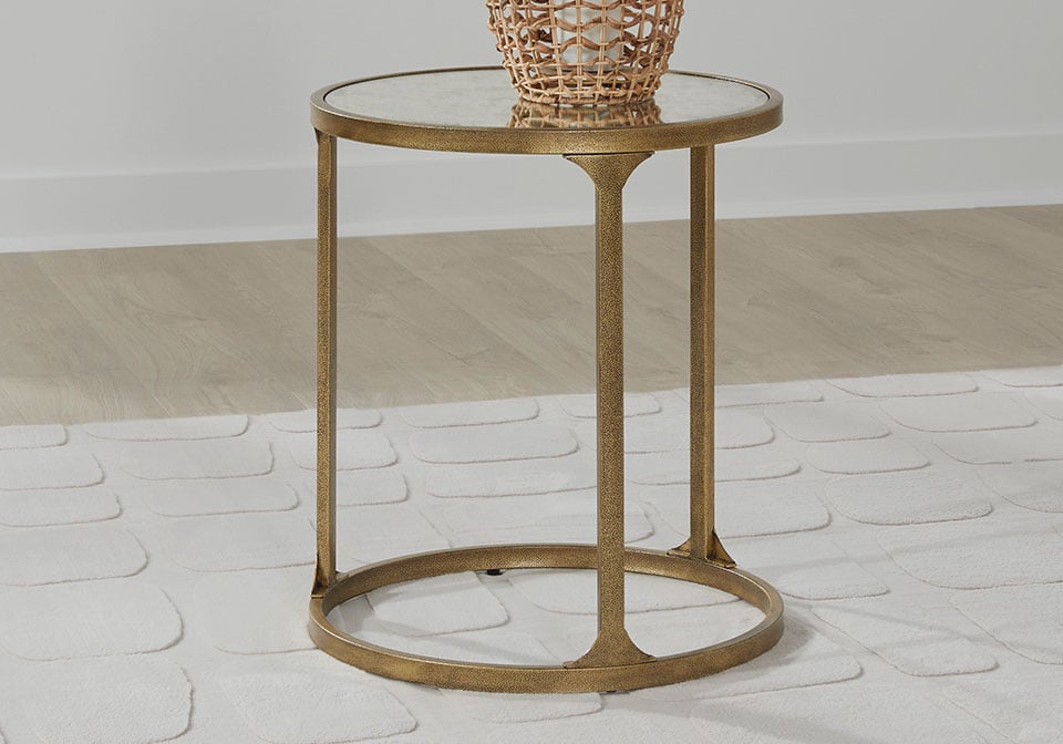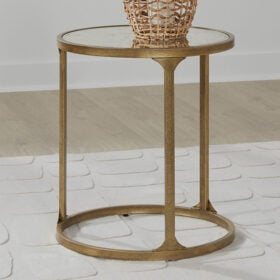 This end table blends a traditional feel with contemporary design cues. Antiqued gold texturing on the frame has the look of timeworn, hand-forged metal. A tempered glass top with a faux marble finish provides a refined contrast. Chic when hosting decor, a lamp or holding entertainment essentials, this table rounds out your living room with transitional flair.