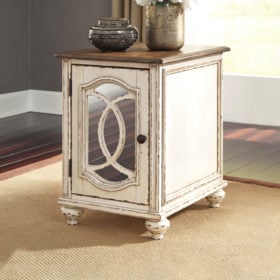 Elevating the art of traditional cottage styling, this chairside end table is sure to serve you beautifully for years to come. Antiqued two-tone aesthetic blends a chipped white with a distressed wood finished top for added charm. Cabinet door features inset mirror with filigree moulding for a fanciful twist.