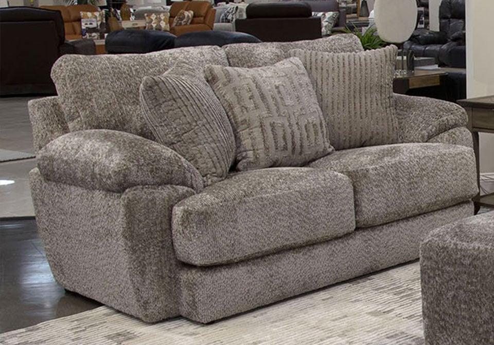 Soft textured chenille upholstery. Deep, plush seating for superior comfort. Pillow-top arms and overstuffed cushions. Stylish tonal accents Timeless neutral design suits any déco. Steel Tech Framing.