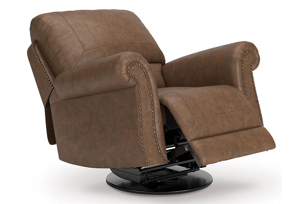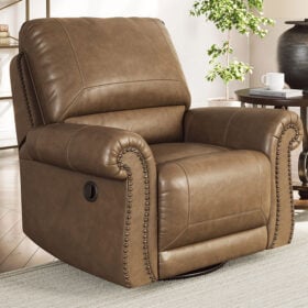 Everyone can have the best seat in the house with this swivel glider recliner. Its nailhead trim puts the finishing touches on the traditional roll arms you love. The recliner’s comfy, durable cushions—wrapped in a rustic yet sophisticated faux leather—keep you feeling relaxed, while its turned legs show that style and quality flow from top to bottom. Plus the smooth reclining motion and 360-degree swivel keep you in the flow of conversation.