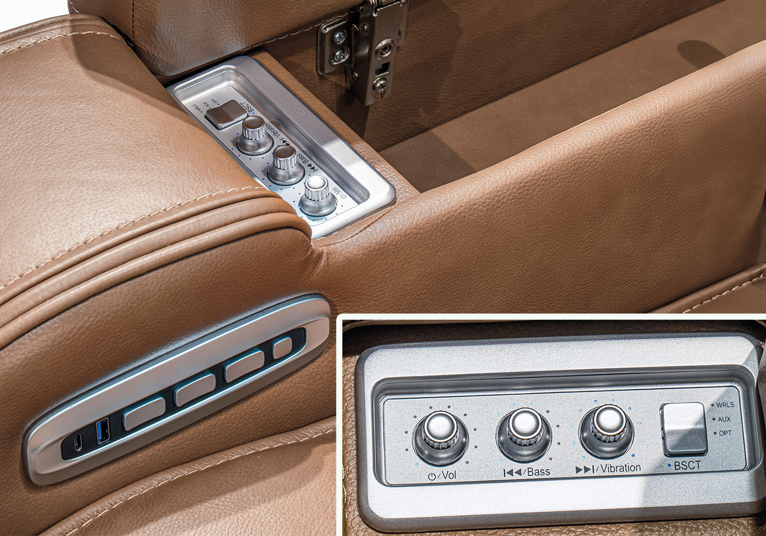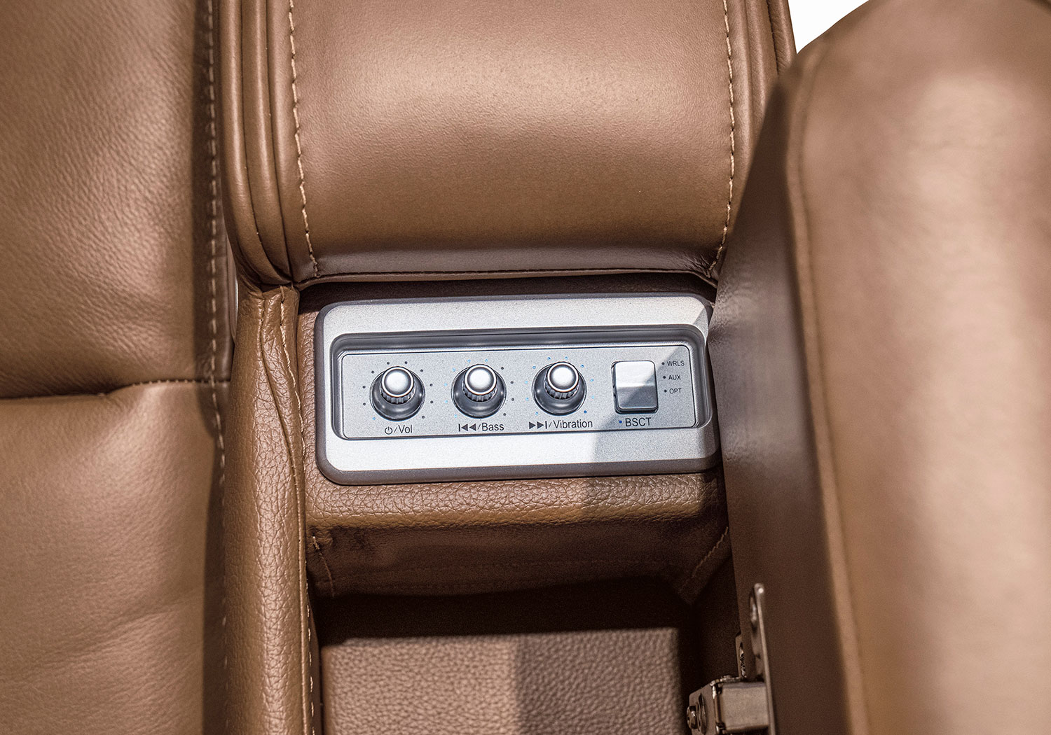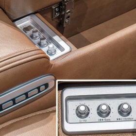 - Armrests with flip-top storage; hidden Thunder control panel with adjustable volume, bass and vibration knobs