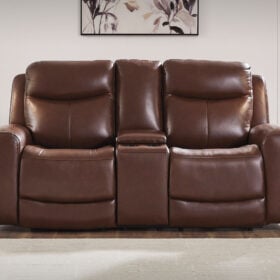 Prepare to be moved. This power reclining loveseat with console combines sleek modern design with all the soothing features you’ve been dreaming of. Wrapped in mahogany leather and faux leather upholstery for affordable luxury, this highly contemporary piece with cozy scoop seating suits your relaxed vibe. Infinite reclining and headrest positions are yours at the touch of a button. It’s the perfect choice for anyone who wants their comfort with a side of style.