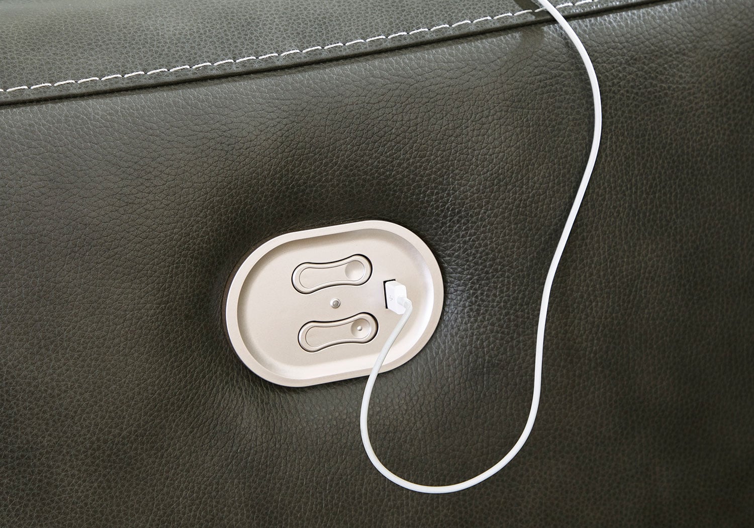 For those seeking to curate a living room retreat that offers superior comfort and a contemporary aesthetic, this sleekly designed power reclining sectional will become your favorite source of at-home serenity. Rest on expertly matched leather and faux leather upholstery, and use the one-touch power control to recline and adjust the headrests with ease. As you recharge after a long day, your devices can too with USB charging. This sectional is visually enticing in a luxe dark gray, with slope track arms and stitched detailing on the back to enhance its modern appeal.