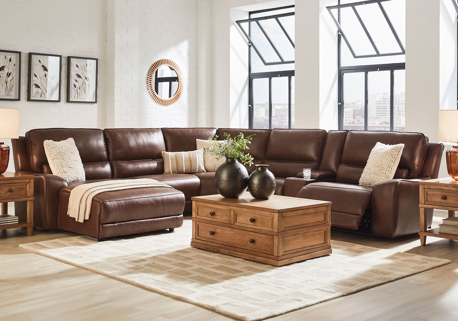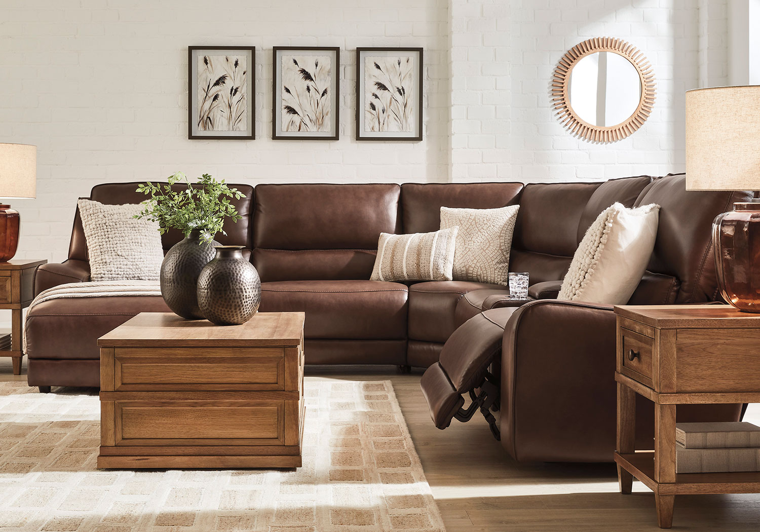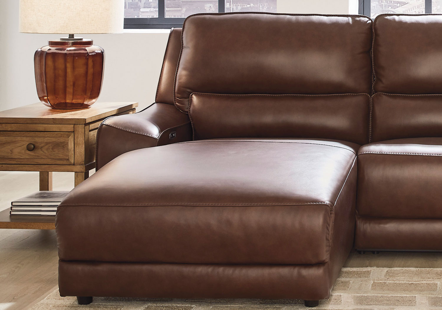 Live and lounge luxuriously. This power reclining sectional with chaise brings an ultra-stylish flair to your home’s central hub. Its seating area is wrapped in top grain leather in a sleek neutral color, giving you a trend-right look made all the better with high-quality materials. And with the simple push of a button, you can adjust the headrests or recline to find your ideal comfort position.