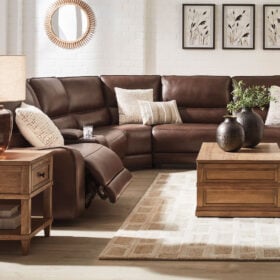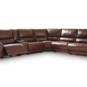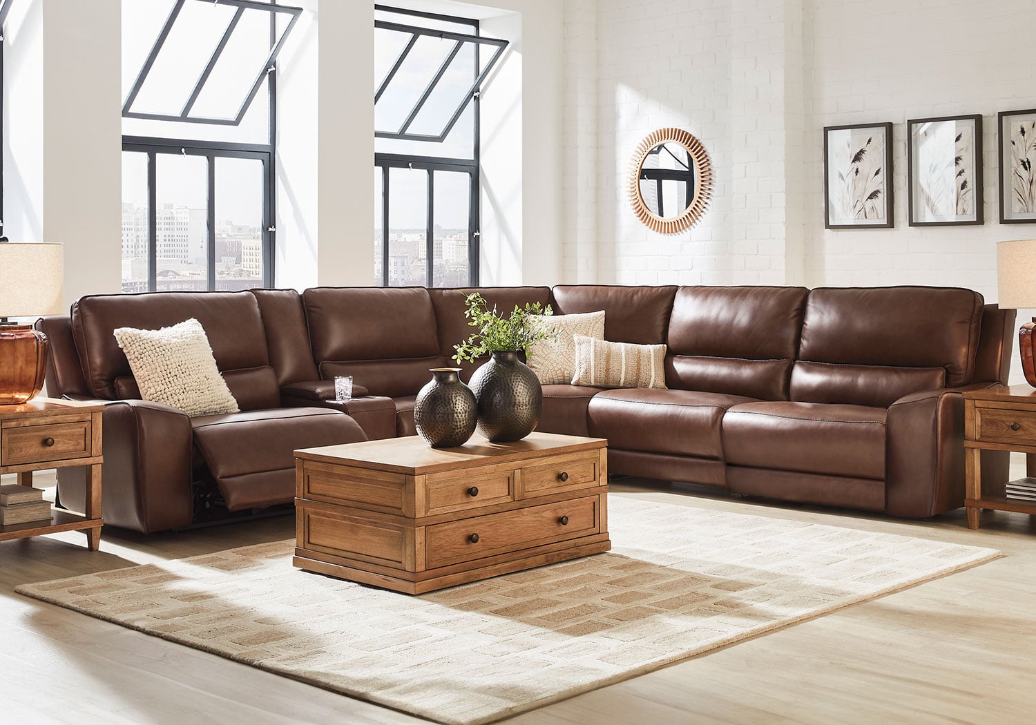 Live and lounge luxuriously. This power reclining sectional with storage console brings an ultra-stylish flair to your home’s central hub. Its seating area is wrapped in top grain leather in a sleek neutral color, giving you a trend-right look made all the better with high-quality materials. And with the simple push of a button, you can adjust the headrests or recline to find your ideal comfort position.