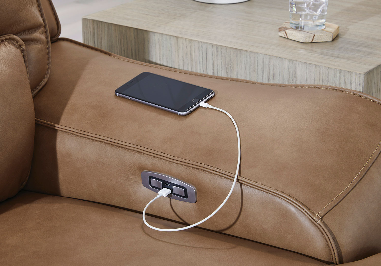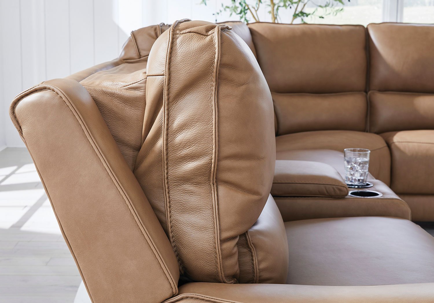 Live and lounge luxuriously. This power reclining sectional with chaise brings an ultra-stylish flair to your home’s central hub. Its seating area is wrapped in top grain leather in a rich caramel color, giving you a trend-right look made all the better with high-quality materials. And with the simple push of a button, you can adjust the headrests or recline to find your ideal comfort position.