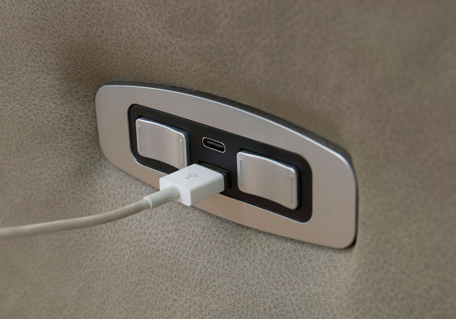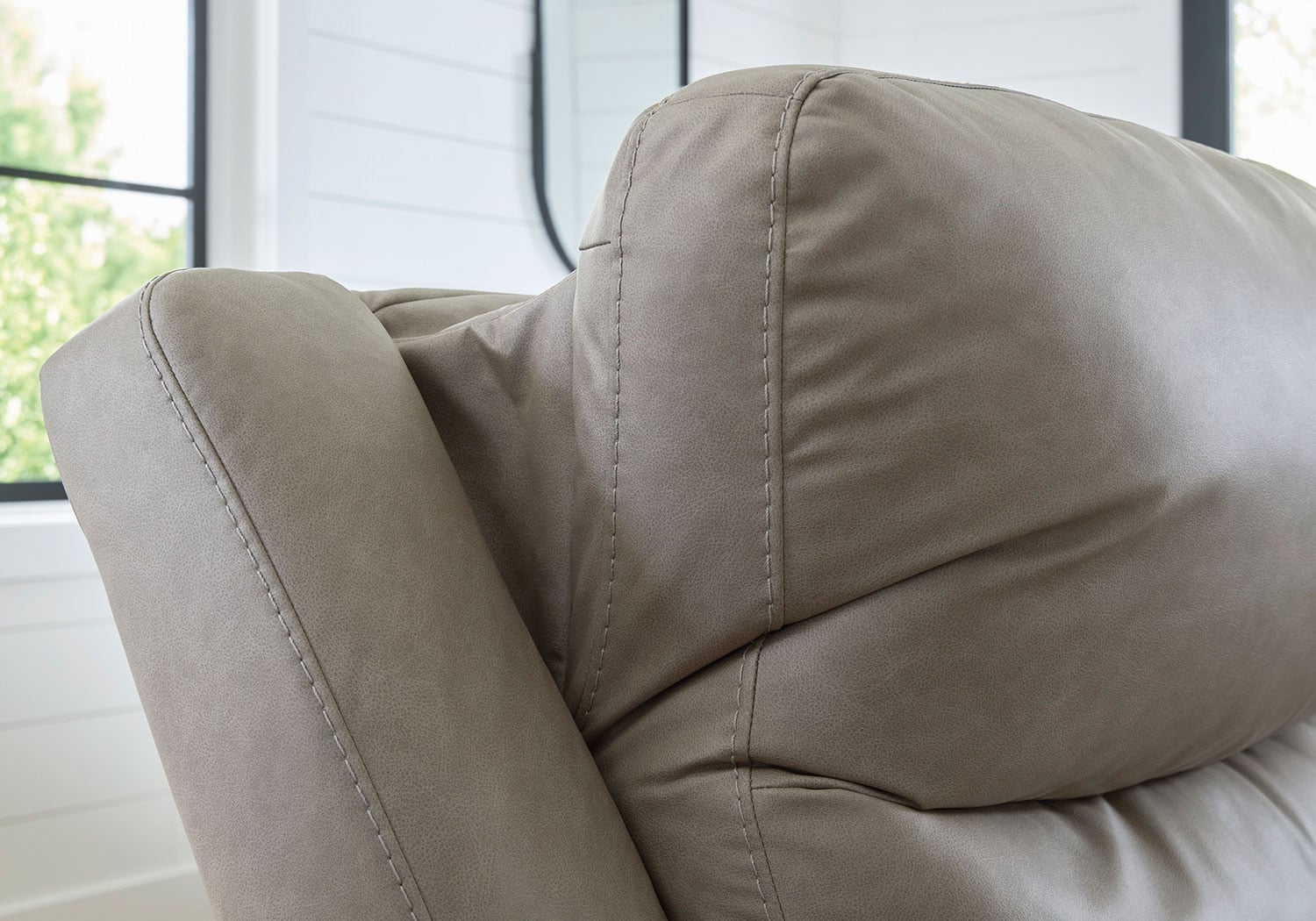 Experience ultimate comfort with this power reclining sectional. Generously cushioned with plush bustle back styling and pillow top track arms, it’s wrapped in a richly neutral upholstery that’s oh-so soft. Jumbo stitching gives the sectional added definition. The one-touch power control and USB charging take the pleasure of reclining to a higher level, while a console with storage and dual cup holders marries function with great form.