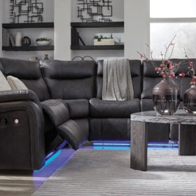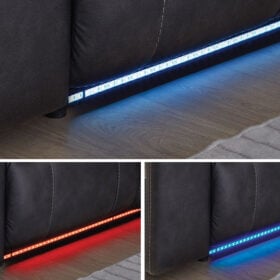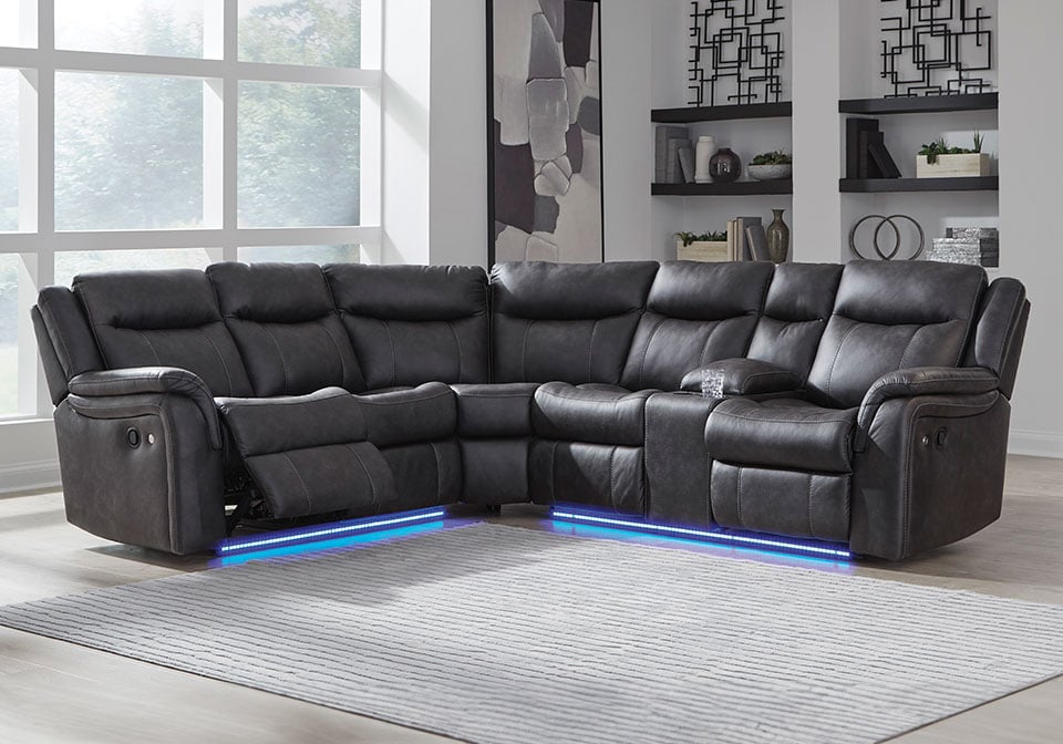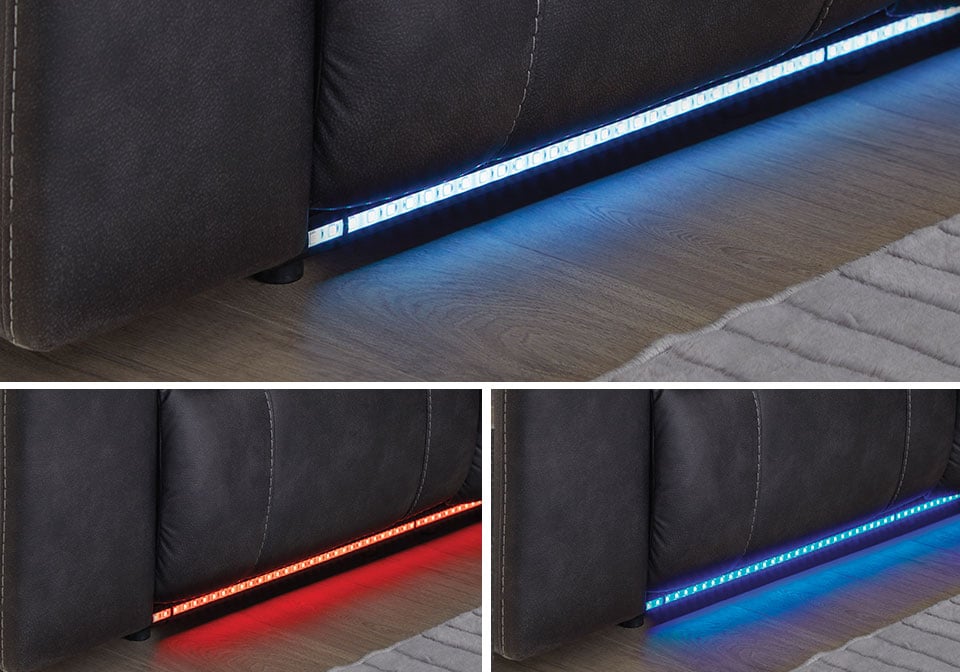 This reclining Series pairs the luxe look of faux leather with must-have functional features. LED lights on the underside put a modern twist on the simply chic design—choose from three colors to add ambiance to movie night or gaming with friends. And you can keep remotes, drinks and other entertainment essentials close with the handy console. Ready to relax? Easy pull tab reclining has you stretched out in no time.