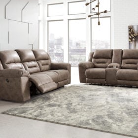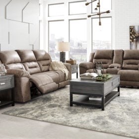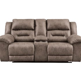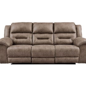 For those that love the cool look of leather but long for the warm feel of fabric, this reclining sofa set delivers both with ease. Its high-performance padded faux leather is remarkably durable and easy to clean, just the thing for family spaces. Channel-stitched back cushions provide indulgent lumbar support for maximum comfort—not to mention fashion-forward flair.
