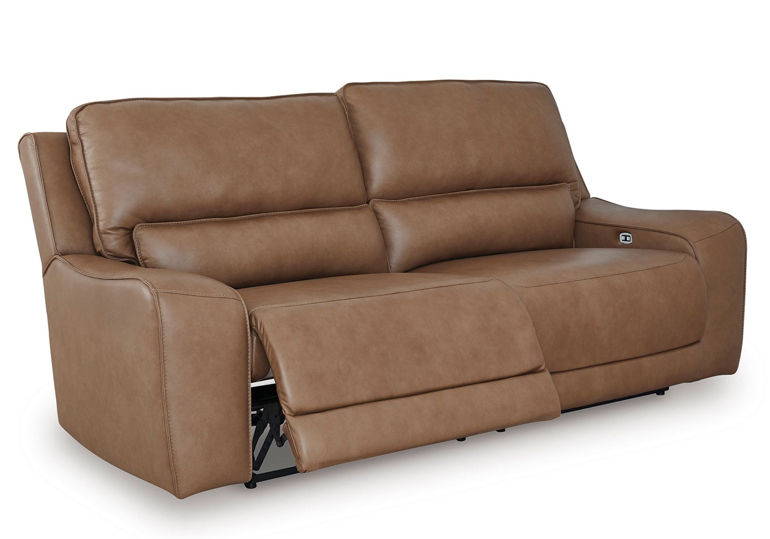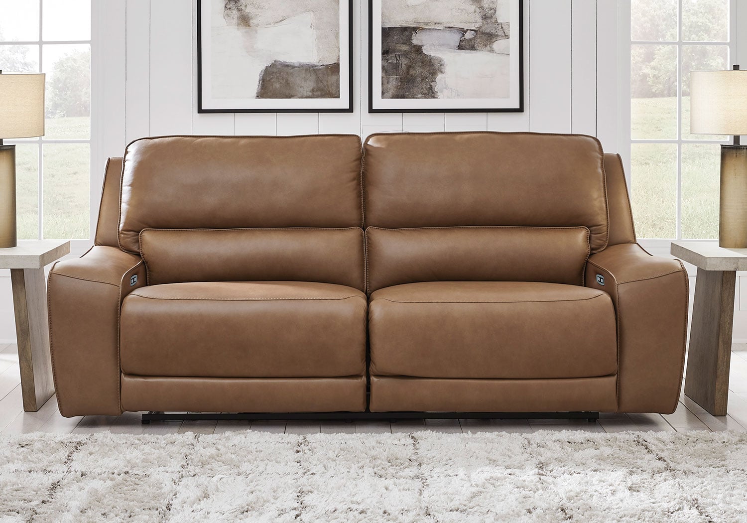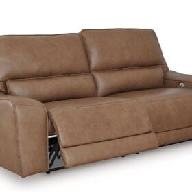 Live and lounge luxuriously. This power reclining sofa brings an ultra-stylish flair to your home’s central hub. Its seating area is wrapped in top-grain leather in a rich caramel coloration, giving you a trend-right look made all the better with high-quality materials. And with the simple push of a button, you can recline or adjust the headrests to find your ideal comfort position.