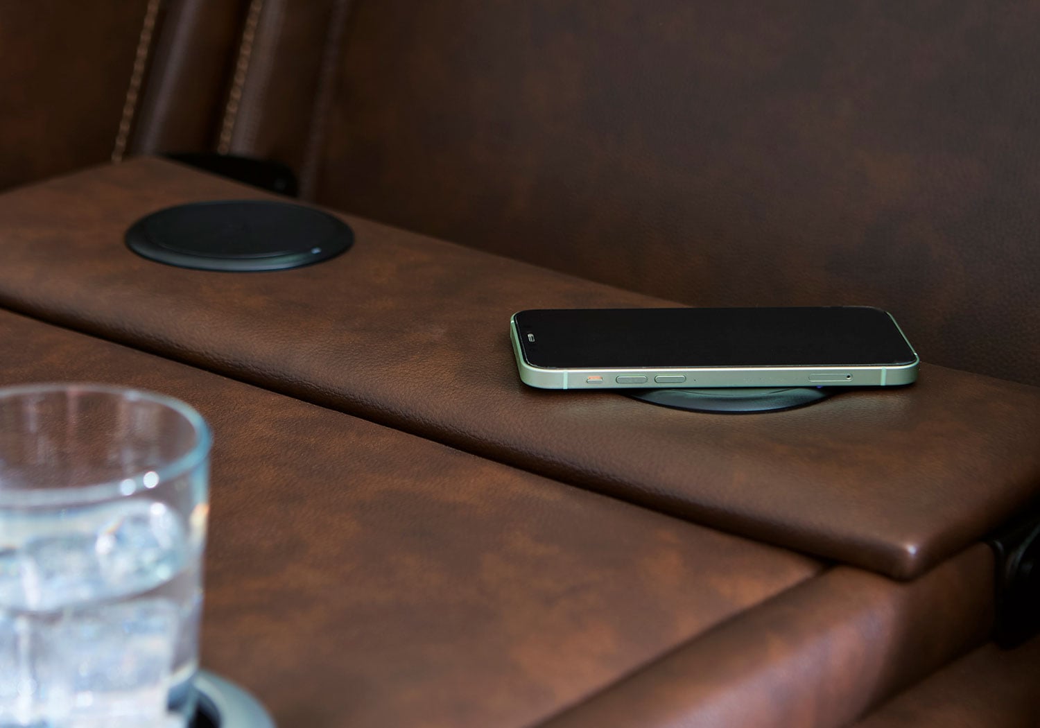 - Drop-down table with LED reading lights, dual cup holders, docking station and wireless charging