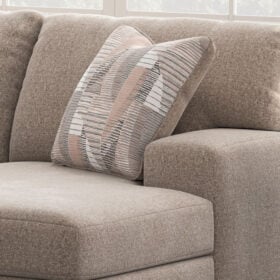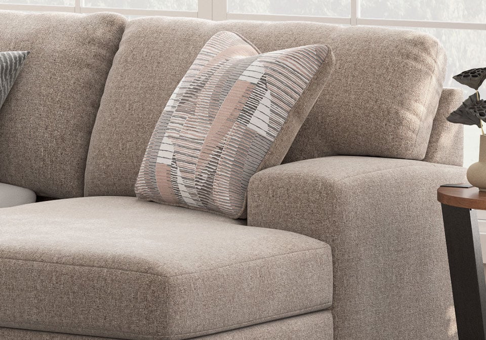 Corner-blocked frame. Attached back and loose seat cushions. High-quality foam cushions wrapped in poly fiber. Accent pillows included. Polyester upholstery. Exposed feet with faux wood finish . Platform foundation system resists sagging 3x better than spring system after 20,000 testing cycles by providing more even support. Smooth platform foundation maintains tight, wrinkle-free look without dips or sags that can occur over time with sinuous spring foundations.