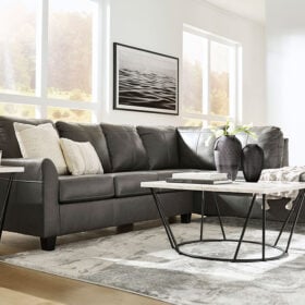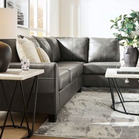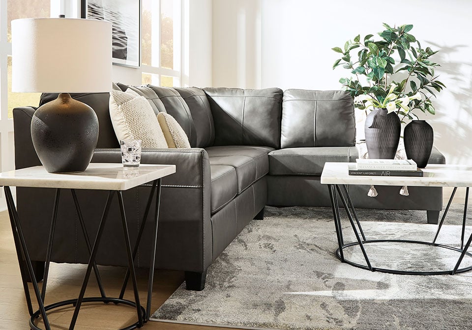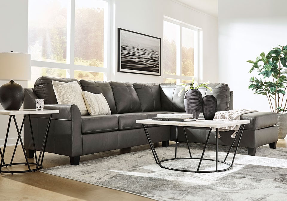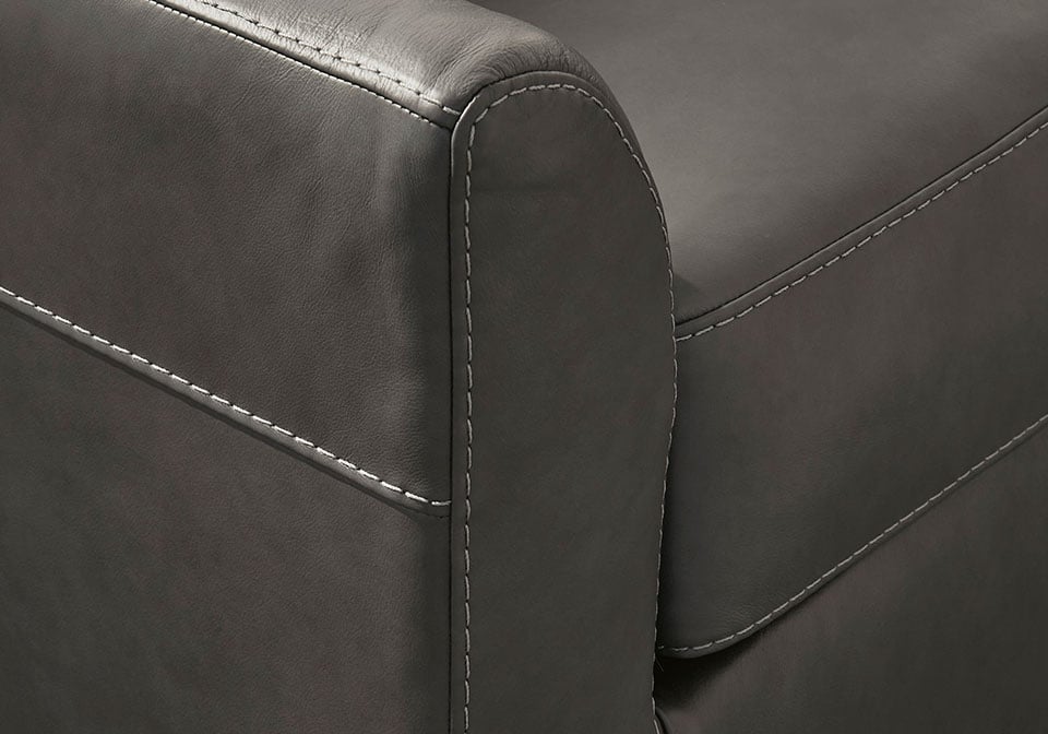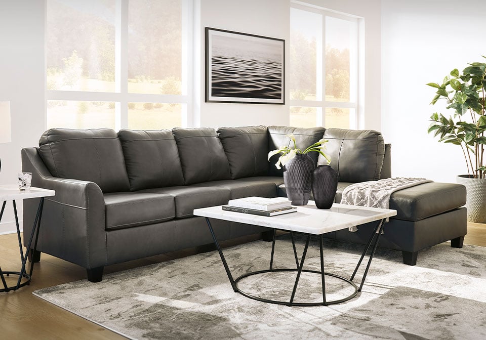 Luxurious lounging, everyday affordability. This sectional prioritizes comfort that suits your modern lifestyle. Its combination of leather and faux leather upholstery indulges you in soft seating, with subtle dimension added by natural pebble detailing. Ending in tapered accent legs, this sectional is a chic way to complete your home’s central, contemporary hub for entertainment.