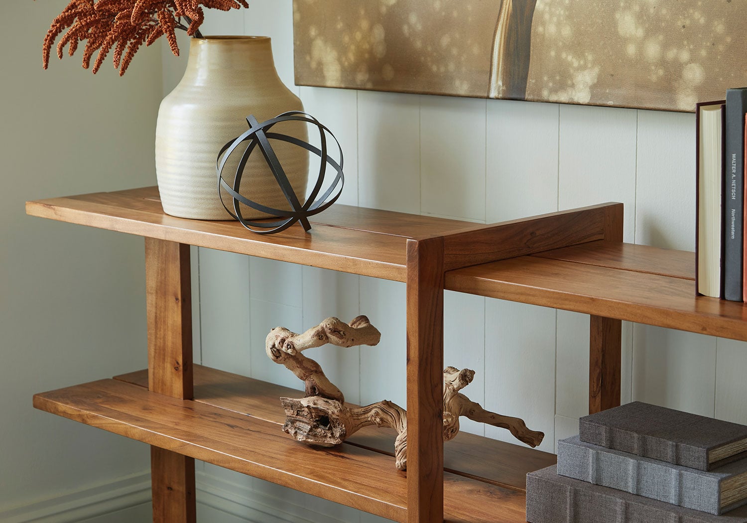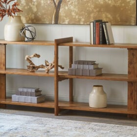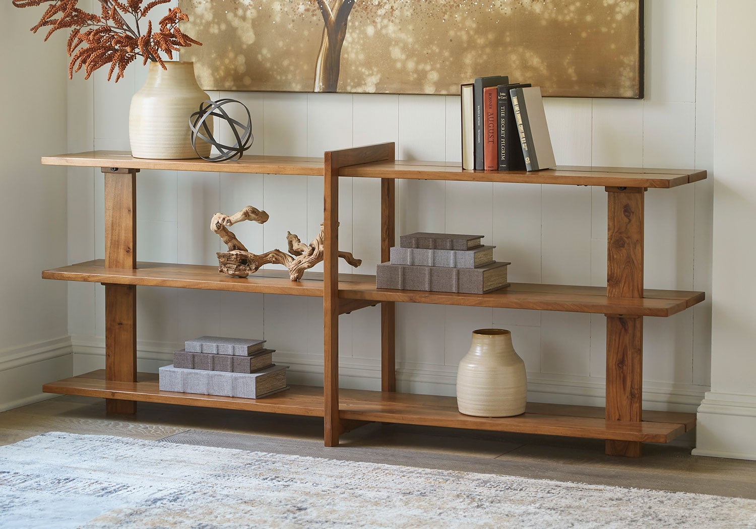 Leaning toward a clean, casually cool look? This solid wood console table is just your style. Its warm honey brown finish exudes an overall relaxed sensibility that feels like home. Three spacious shelves display accents effortlessly.