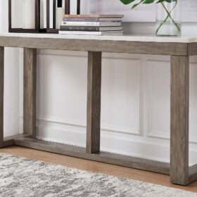 This sofa table is simple in design but big on style. Finished with a trend-right grayish brown wood tone, its bold, blocky profile and natural marble top are timeless, classic choices. This table is ideal for pairing with an ottoman to pull extra seating into the room, or for remaining clean and sleek on its own.