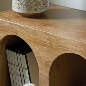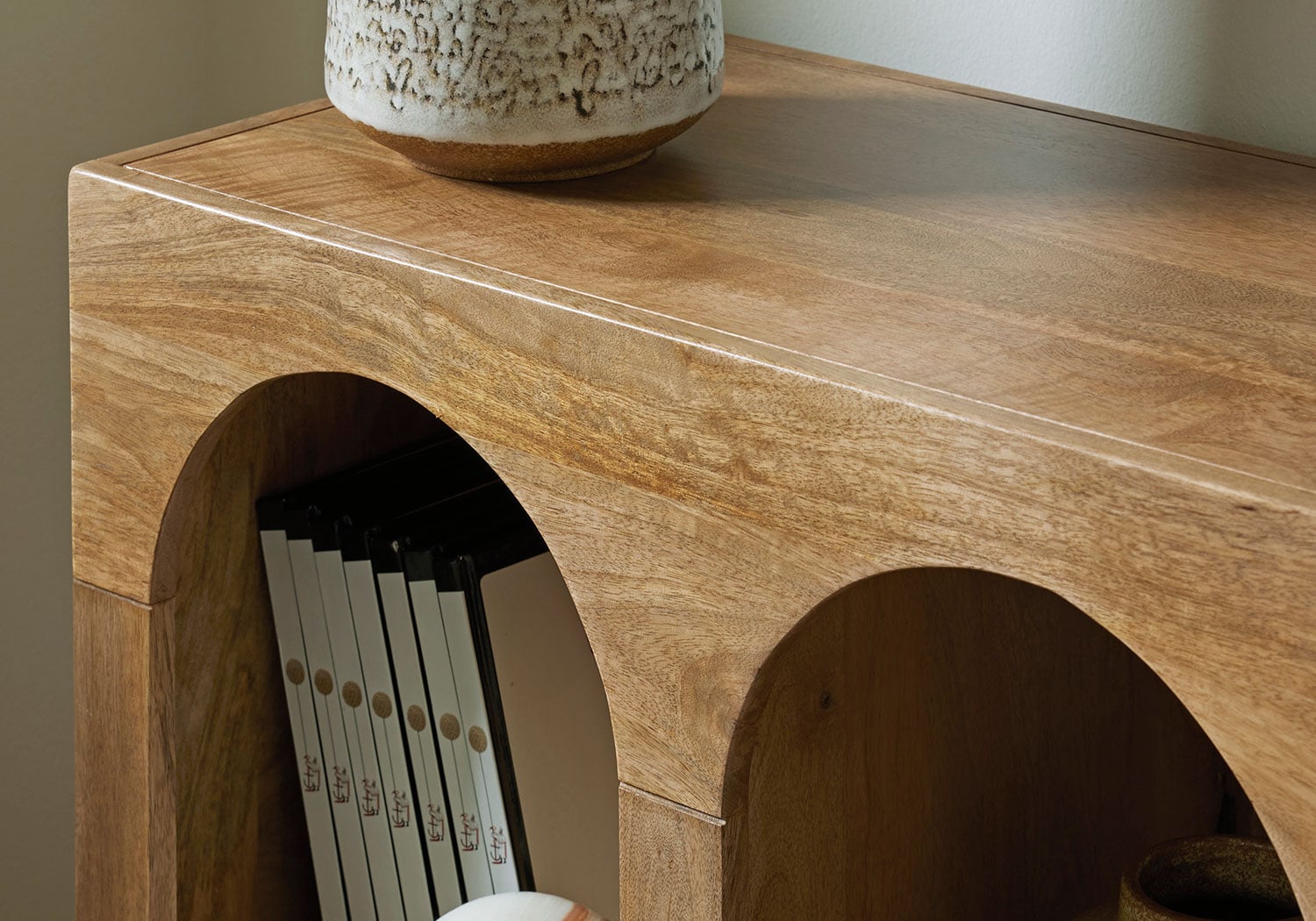 Sporting an arch design, this console sofa table is a striking statement piece for lovers of casual design. Talk about style with purpose—crafted of mango wood in a natural brown finish, this piece delivers space to show off decor on top and rest a few reads on the shelves.