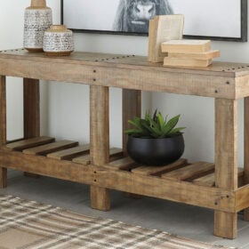 As this console table proves, sometimes less is more. Dramatically transform your living space with the warm and rustic appeal of solid wood construction and open-slat shelving. Washed in a light brown finish, this sofa table sets a new standard for down-to-earth refinement.