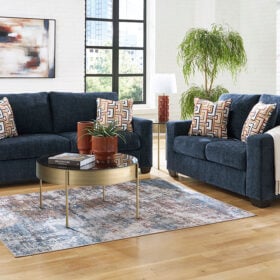Looking to make a bold statement with color? Liven up your living room with this Series. Its trend-right navy blue upholstery adds a playful pop of color to your decor. Bold and eclectic accent pillows complete the look. Pairing posh style with everyday comfort, this piece is a welcome addition to contemporary spaces.