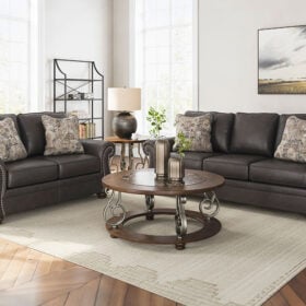 Everyone can have the best seat in the house with this Series. Its nailhead trim puts the finishing touches on the traditional roll arms you love. Comfy, durable cushions—wrapped in a rustic yet sophisticated faux leather—keep you feeling relaxed. Chenille Accents in a distressed motif pattern add another layer of comfort. Turned legs show that style and quality flow from top to bottom.