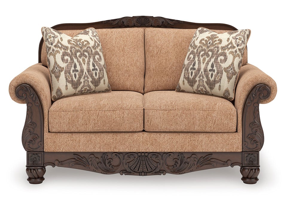 Corner-blocked frame. Attached back and reversible seat cushions. High-resiliency foam cushions wrapped in poly fiber. Pillows with feather-fiber blend. Polyester upholstery. Decorative turned legs with faux wood finish. Platform foundation system resists sagging 3x better than spring system after 20,000 testing cycles by providing more even support. Smooth platform foundation maintains tight, wrinkle-free look without dips or sags that can occur over time with sinuous spring foundations.