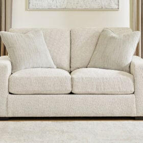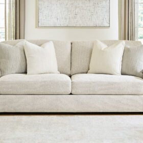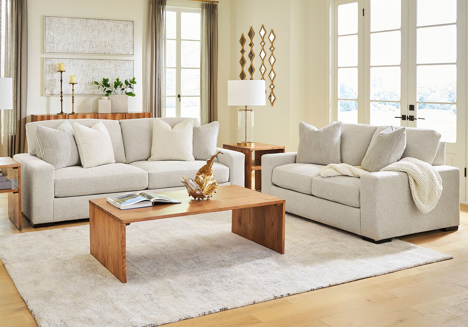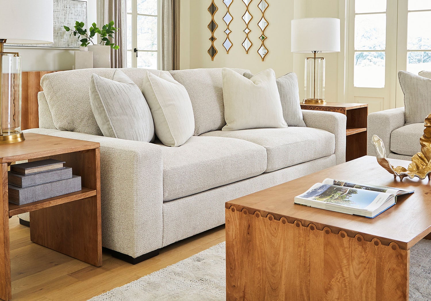 Reinforced frame provides added stability. Reversible seat and back cushions. High-density foam cushions wrapped in feather-fiber blend jacket. Pillows with feather-fiber blend. Polyester upholstery. Non-skid, low-profile accent legs with faux wood finish. Platform foundation system resists sagging 3x better than spring system after 20,000 testing cycles by providing more even support. Smooth platform foundation maintains tight, wrinkle-free look without dips or sags that can occur over time with sinuous spring foundations.