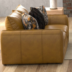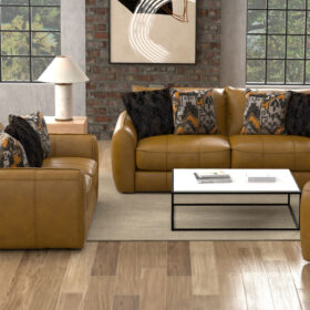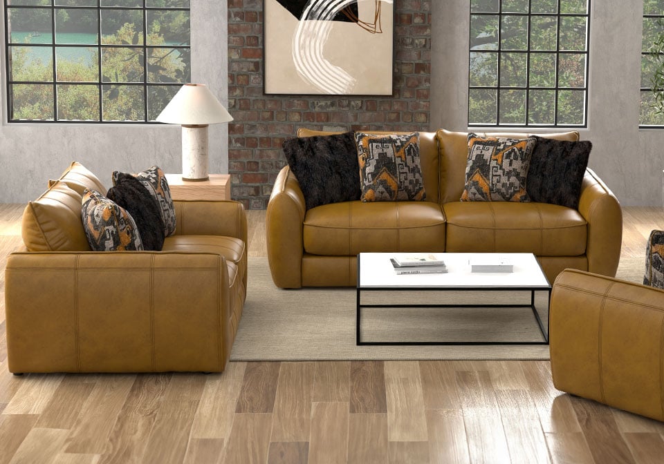 Bring warmth and modern charm to your living room with this luxurious Living room Series. Upholstered in rich camel-toned Genuine Top Grain Leather! Comfort Coil Seating featuring Comfor-Gel, bold accents, and curved arms for stylish comfort that elevates any contemporary space.