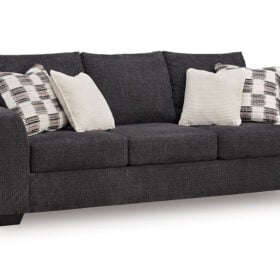 Reinforced frame provides added stability. Attached back and loose seat cushions. High-quality foam cushions wrapped in poly fiber. Pillows with soft polyfill. Polyester upholstery. Exposed feet with faux wood finish. Platform foundation system resists sagging 3x better than spring system after 20,000 testing cycles by providing more even support. Smooth platform foundation maintains tight, wrinkle-free look without dips or sags that can occur over time with sinuous spring foundations.