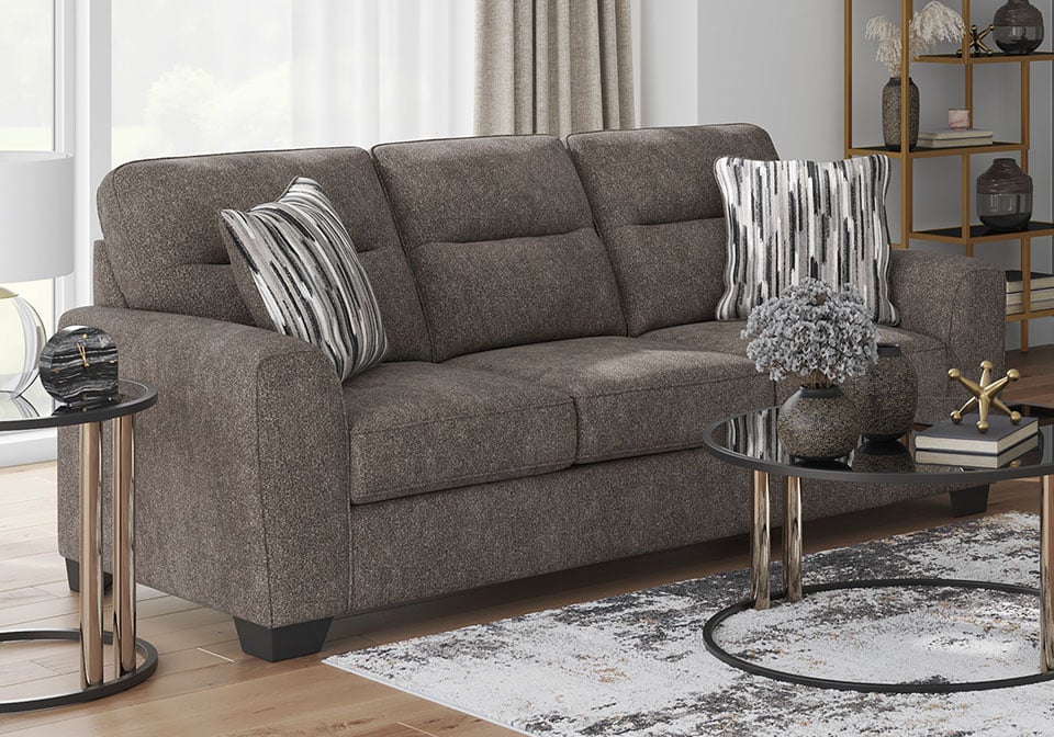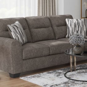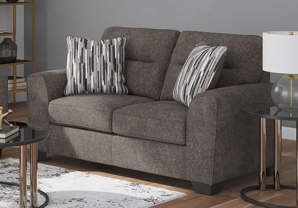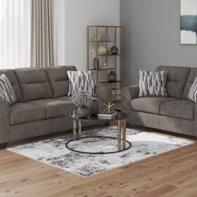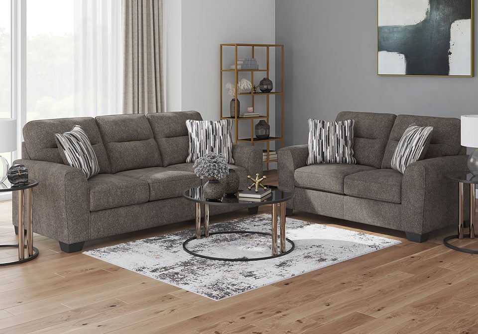Strike a balance between the indulgent comfort you crave and the contemporary aesthetic you long for. The fabulously soft, graphite-colored upholstery of this sofa set takes neutrals to new heights. Plus there’s plenty of room to spread out and relax solo or with your bestie. Geometric-patterned accent pillows perfect the richly on-trend aesthetic.