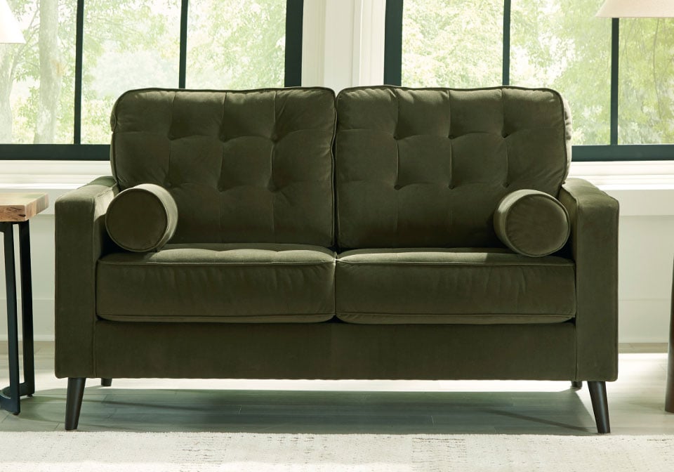 This Series strikes the perfect balance between elevated and eclectic. Contemporary lines and a richly hued velvet upholstery keep things chic. Design details like button tufting and splay legs add mod flair. It’s sure to keep your living room luxuriously on trend—at a price that won’t break the bank.