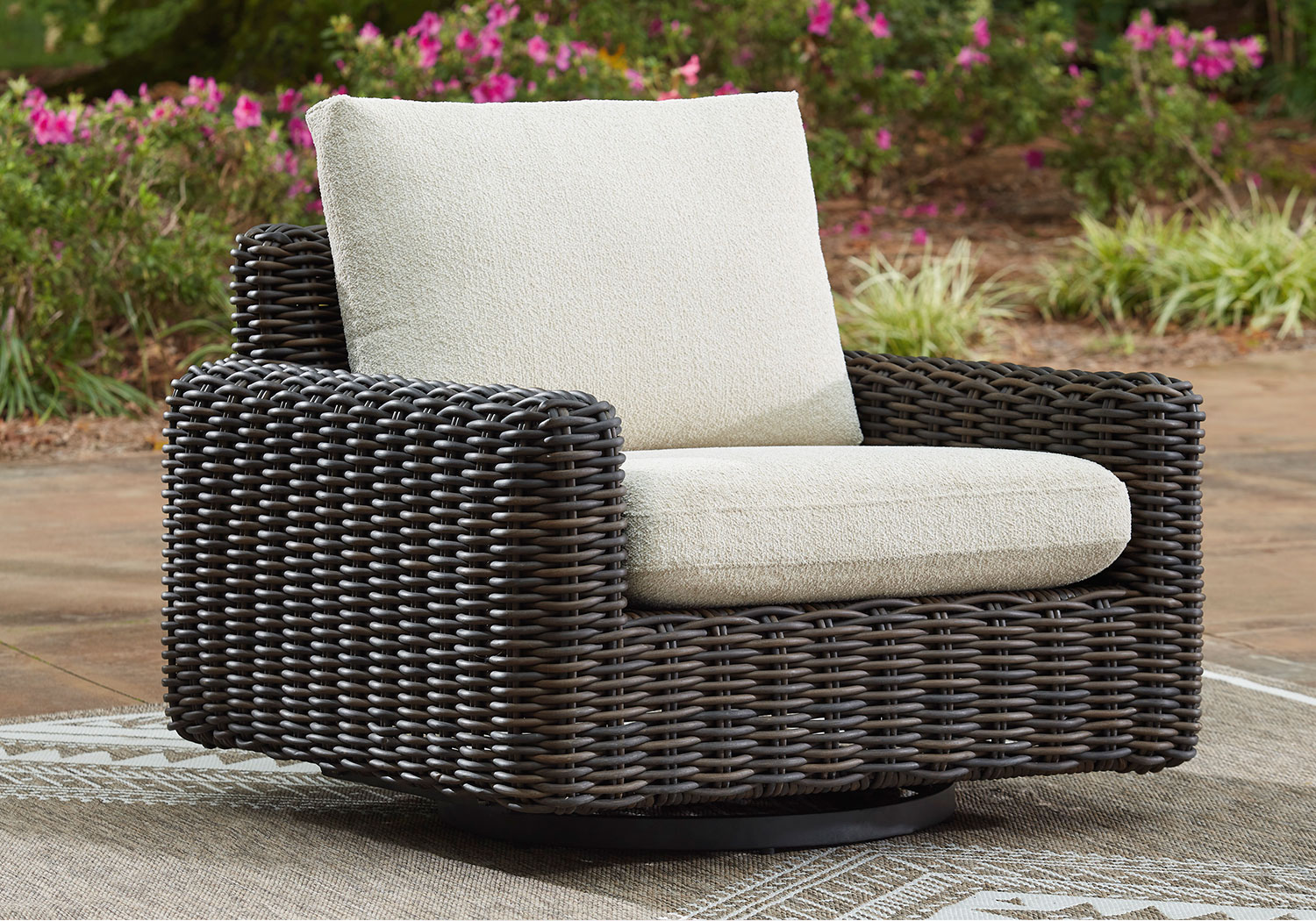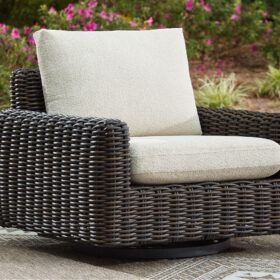 Add luxury, comfort and durability to alfresco fun. This outdoor swivel glider lounge chair captures the textural beauty of wicker while withstanding the elements, from rain to shine. With a UV-resistant design, the wonderfully low-maintenance Nuvella+™ fabric maintains its good looks over time. Deep, roomy seating completes the piece, offering ample space to sprawl out.