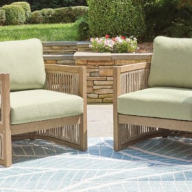 Round out your outdoor living space with the naturally beautiful look of wood. This cushioned lounge chair will serve up seasons of relaxation on your back deck or sitting pretty by the pool. Its gently curved open-weave design, crafted from eucalyptus wood and polyester rope, is the perfect merger of high fashion and lasting durability. Plush cushions are wrapped in cleanable, UV-resistant Nuvella® fabric, making stylish living a breeze.