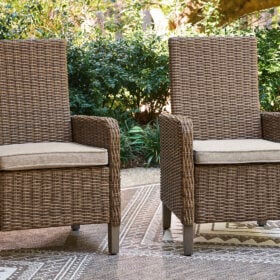 Chairs made with All-weather resin wicker handwoven over rust-resistant aluminum frame with durable powder coated finish. Solution-dyed high-performance fabric. Nuvella is an outdoor fabric that can be cleaned and offers UV resistance.