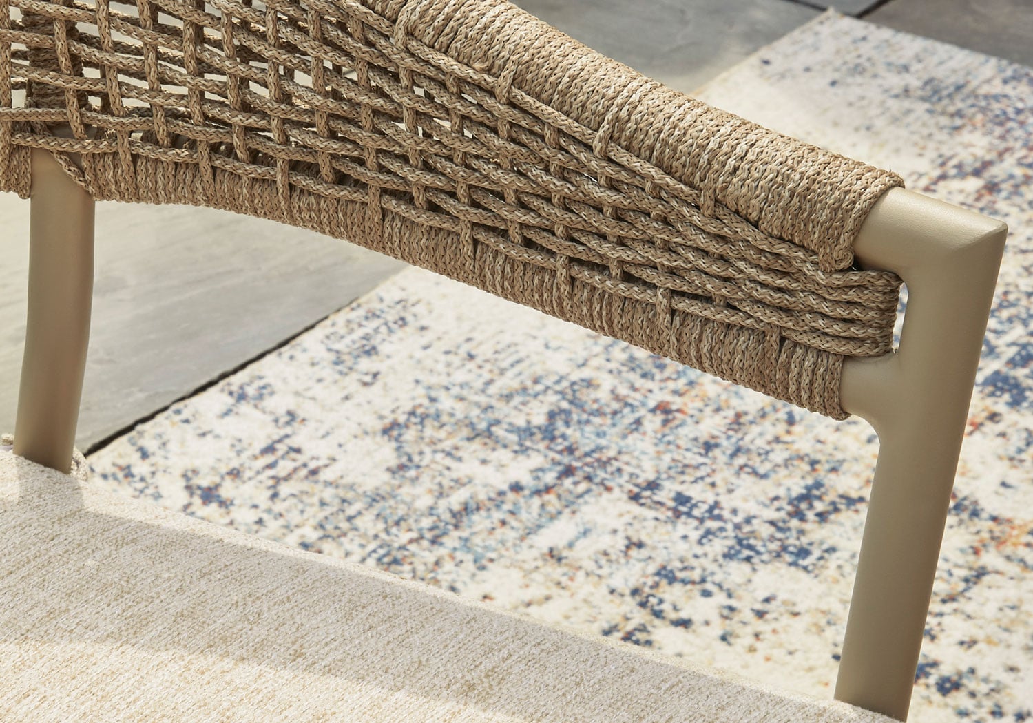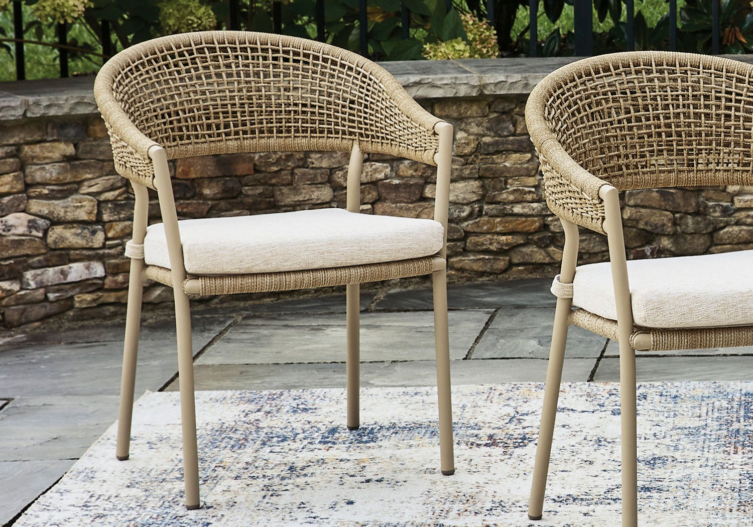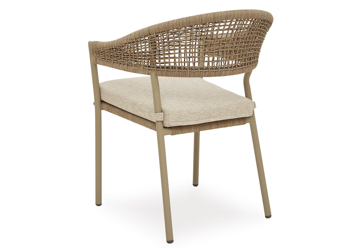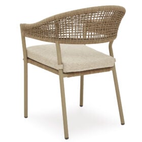 Whether decking out your deck or patio or making a splash by the pool, this outdoor arm chair with cushion is all about easy-breezy outdoor living. Its gently curved back features a nicely neutral polyester rope wrap over a sturdy, rust-resistant aluminum frame that’s sure to weather the seasons beautifully. The cushion is covered in high-performance Nuvella® fabric that withstands the elements and is oh-so-easy to clean.