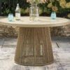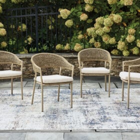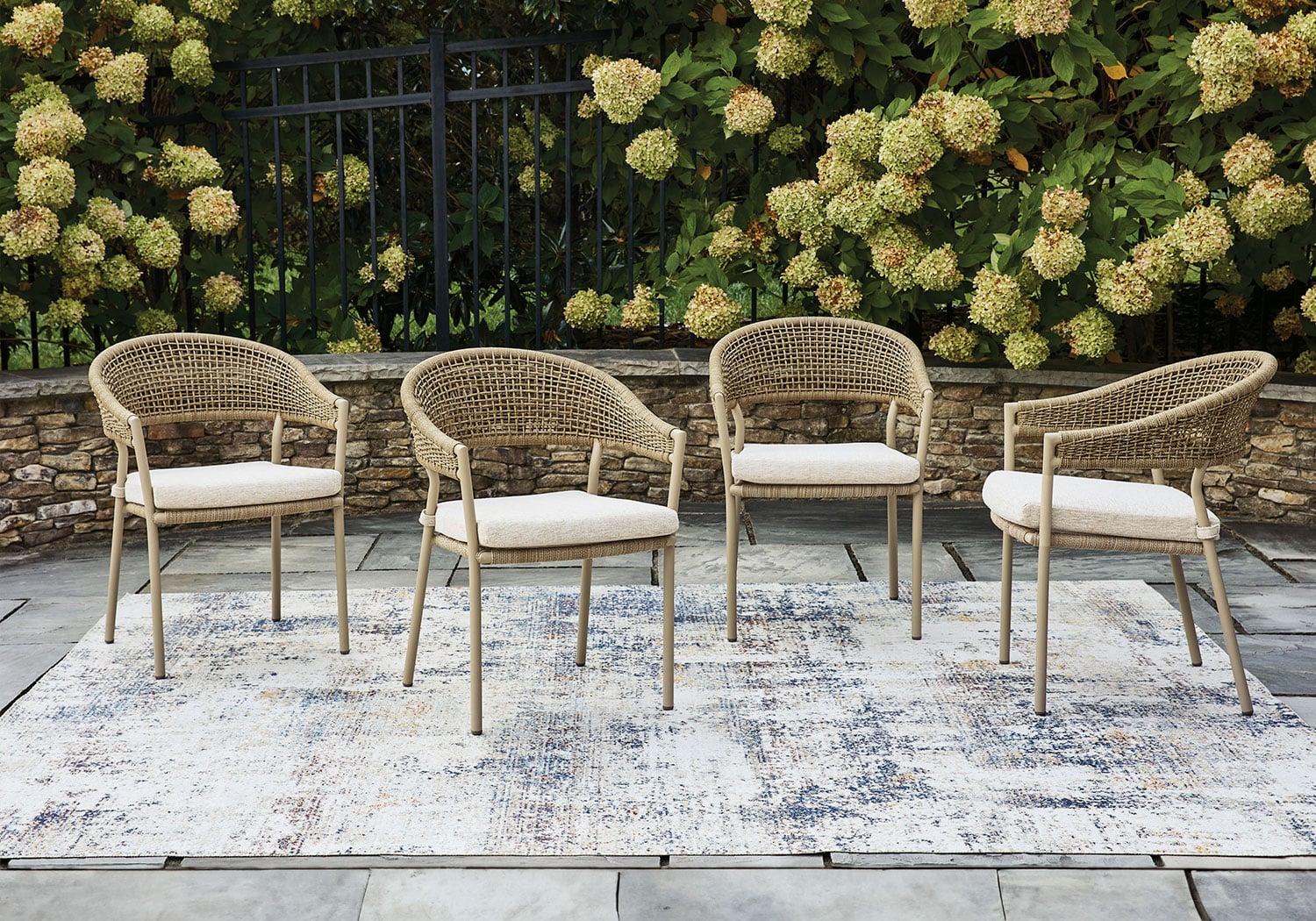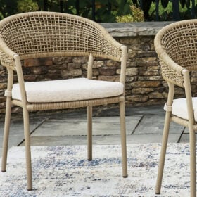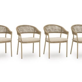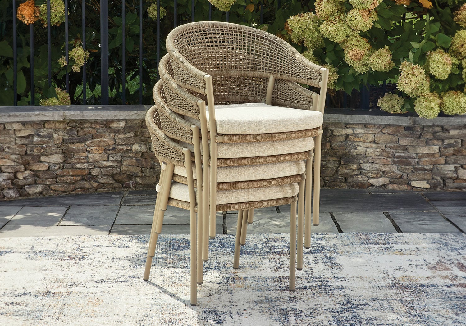 Whether decking out your deck or patio or making a splash by the pool, this outdoor arm chair with cushion is all about easy-breezy outdoor living. Its gently curved back features a nicely neutral polyester rope wrap over a sturdy, rust-resistant aluminum frame that’s sure to weather the seasons beautifully. The cushion is covered in high-performance Nuvella® fabric that withstands the elements and is oh-so-easy to clean.