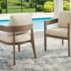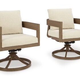 Rust-resistant aluminum frame with durable powder coated finish. Powder coated aluminum resists rusting and fading. Wood-look finish. Stainless steel hardware. Designed to withstand the harsh elements of the outdoor. Chairs with All-weather foam cushion core wrapped in soft polyester. Zippered cushions covered in solution-dyed high-performance fabric. Nuvella+ is an outdoor fabric that can be cleaned and offers enhanced UV resistance. Stainless steel hardware. 360-degree swivel.