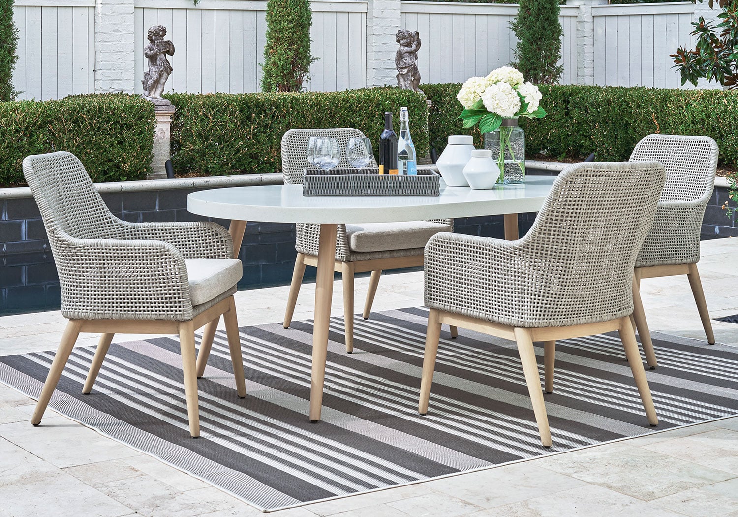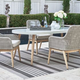 This dining set invites your casual contemporary style outdoors. With an elegant faux stone top, it expertly marries refined design with durability. At this table, breezy summer mornings and cold winter nights are made all the more enjoyable. Breezy summer mornings and cold winter nights are made all the more comfortable with high-performance Nuvella+ fabric covering the seat cushion.