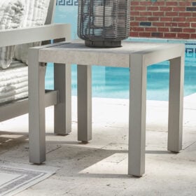 Indulge in luxe outside living without sacrificing longevity. This outdoor end table combines natural beauty with a sleek aluminum frame. Soak up the sun poolside or on the porch—it’s the perfect perch for your drink or latest read. And with a chic gray stone tabletop, style and durability go hand in hand.