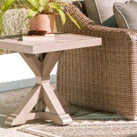 Who says the great outdoors isn’t made for luxury living? This outdoor end table offers all of the high-end design and durability you could ask for, and then some. Its all-weather, rust-resistant aluminum frame provides the easy-breezy look you love without the high maintenance. Rest assured—with this table, you can focus less on upkeep and more on relaxation.