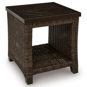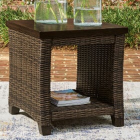 Looking for that special spot to relax and entertain on your deck or patio? Then you’ll love this outdoor end table. With beautifully textured resin wicker over a sturdy aluminum frame, it brings so much style and warmth to your outdoor space. And the hand-brushed, wood-look finish means you can spend less time worrying and more time chilling. What a smart and stylish way to create a beautiful, lasting space for everyone to enjoy.