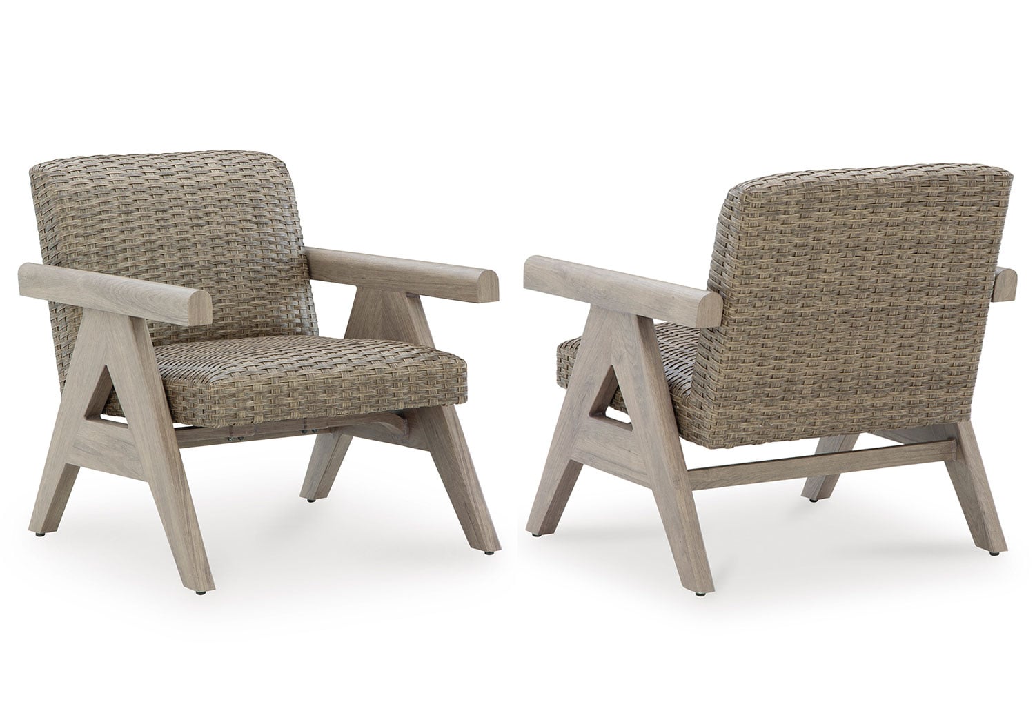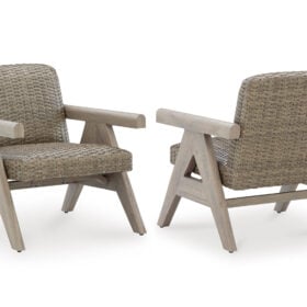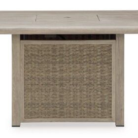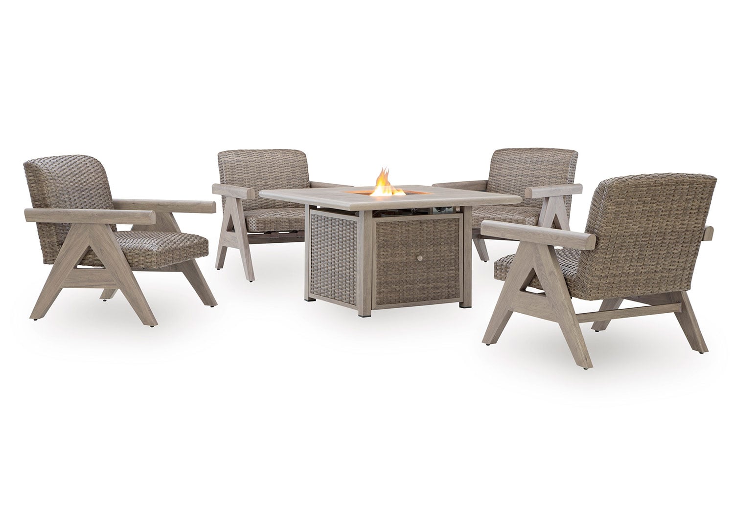 Includes gas fire pit table with CSA-approved 50,000 BTU stainless steel burner, glass beads and all-weather protective cover. All-weather resin wicker handwoven over rust-free aluminum frame with durable powder coated finish. Aluminum top. Stainless steel hardware. Cabinet door conceals gas propane tank (not included). Battery-operated ignition system with adjustable flame control; battery included. Gas line or propane tank connector hose not provided. Rocking Lounge Chairs with Quick-dry foam cushion & Gentle rocking motion.