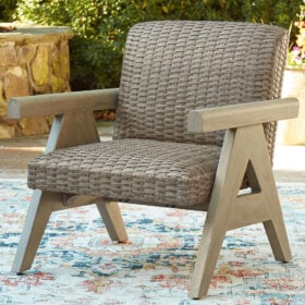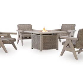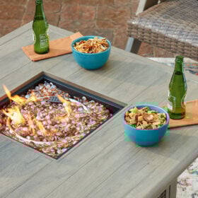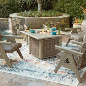 The naturally beautiful look of wood. The convenience of a crackling fire. And did we mention durability? This fire pit table set is crafted with elevated style and everyday function in mind. With sturdy aluminum construction and a protective cover, it withstands the weather while making a chic statement on your deck or patio. A simple press of the button quickly ignites the flame, so you can get to enjoying warm summer evenings or cozy winter nights.
