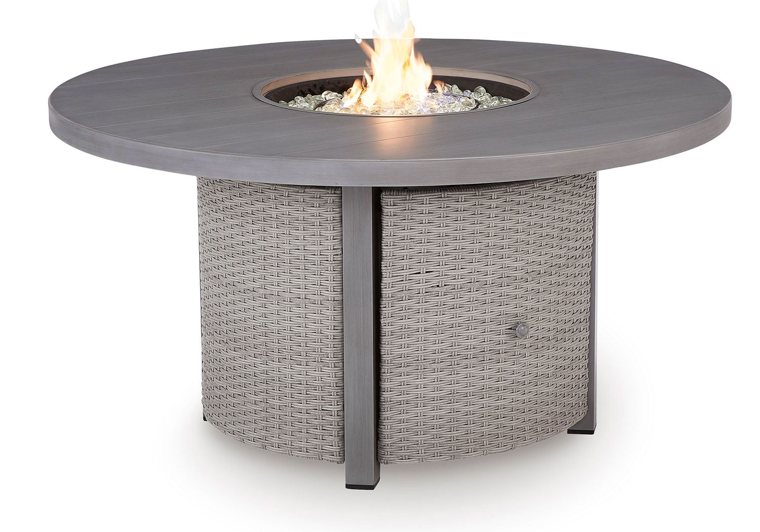 High style crafted for low-maintenance living. Turn your outdoor space into a sweet retreat with this fire pit table set. The casually cool set entices with easy-breezy gray resin wicker over an all-weather aluminum frame, for an upscale aesthetic that’s downright durable. A stainless steel burner with glass beads adds a captivating element sure to wow. The casually cool piece entices with easy-breezy gray resin wicker over an all-weather aluminum frame, for an upscale aesthetic that’s downright durable. Wrapped in high-performance Nuvella® fabric, the plush cushions are indulgently comfortable yet so easy to maintain Gather round for mealtime, morning coffee chats or cocktails in the great outdoors