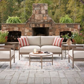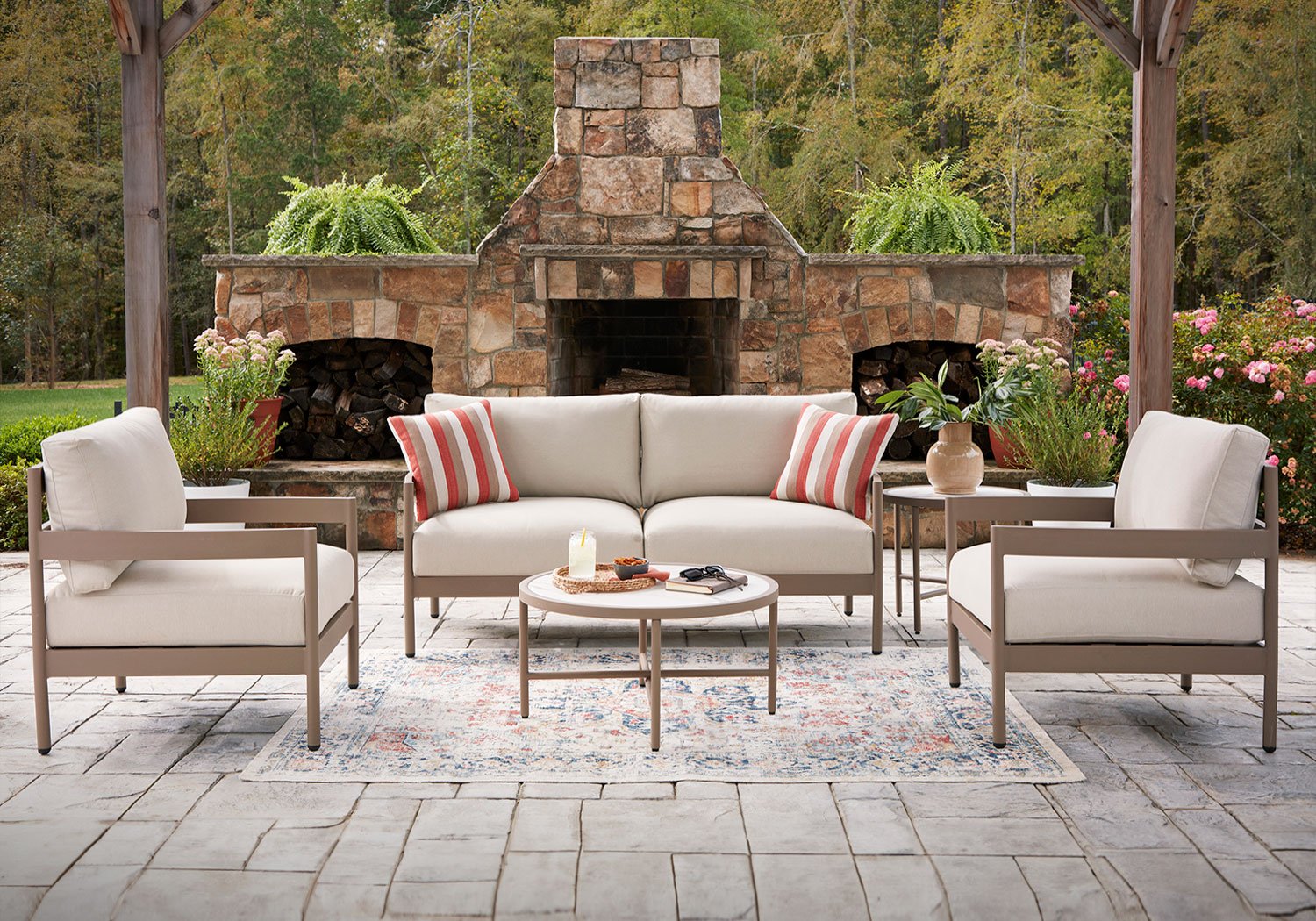 Indulgently comfortable furniture shouldn’t be limited to inside spaces. Create your own outdoor oasis with this 5-piece outdoor ensemble. It’s a study in form and function, with clean-lined, durable aluminum frames that are ready for many seasons of fun in the sun. Plush lounge chair and loveseat cushions wrapped in high-performing Nuvella® fabric are comfortable and carefree, while sintered stone tabletops lend an air of natural elegance.