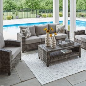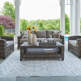 Luxurious comfort, meet outdoor living. This furniture set brings superior seating areas alfresco, taking cues from contemporary interiors with its versatile neutral hues and ample cushioning. Soak up the sun on summer days or cozy up with cocoa on winter nights—this set’s durable design allows you to enjoy chic seating through all seasons.