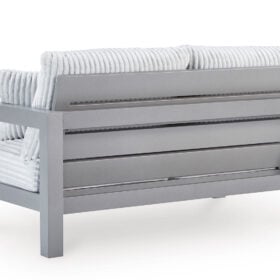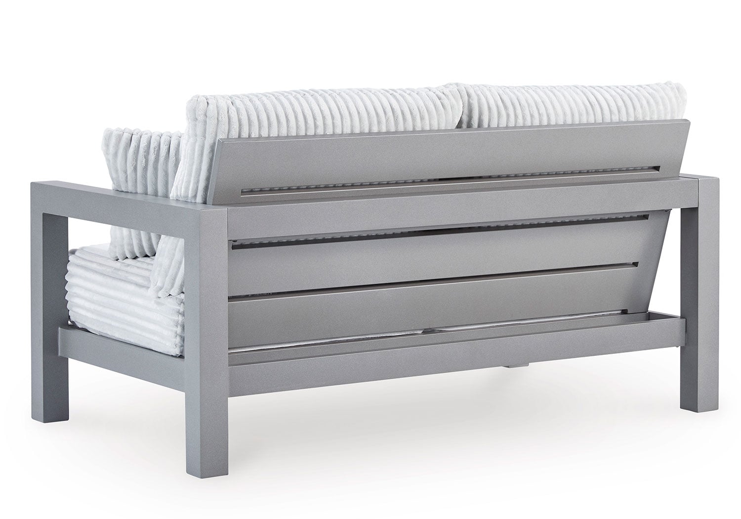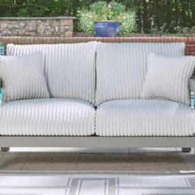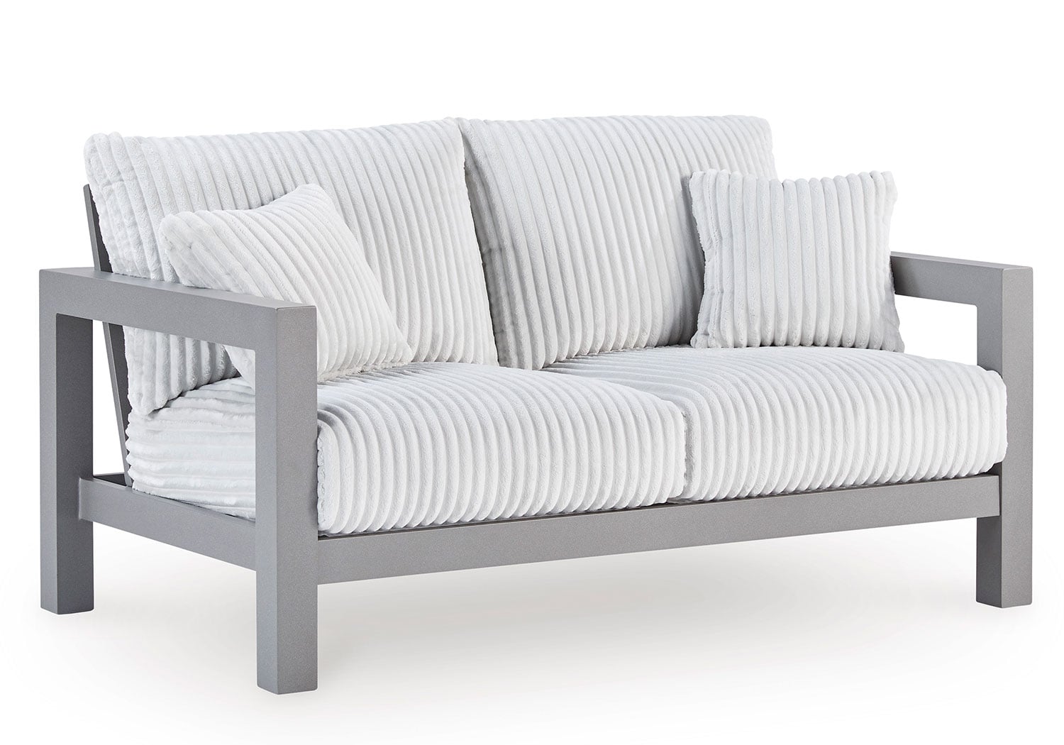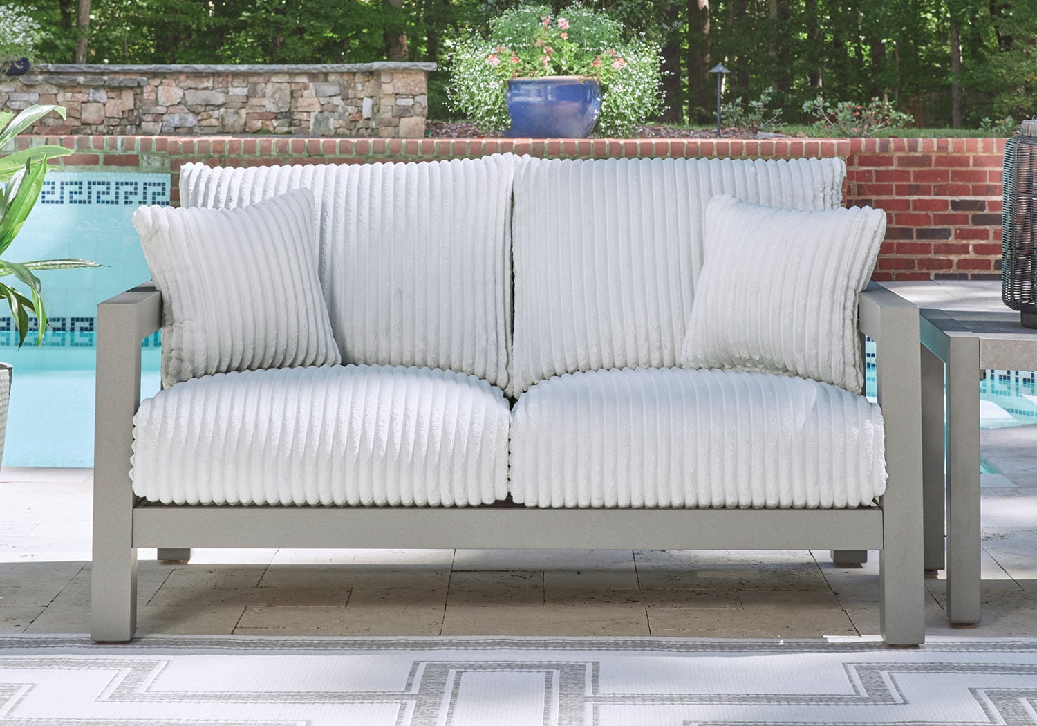 Indulge in luxe outside living without sacrificing longevity. This outdoor loveseat combines on-trend texture with a sleek aluminum frame. Lounge poolside or on the porch—the comfy cushions are a chic spot for you and a partner to soak up the sun. And with cleanable, UV-resistant Nuvella® fabric in a showstopping corded look, style and durability go hand in hand.